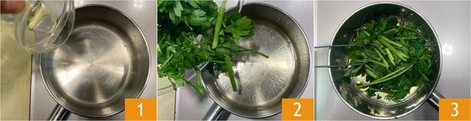 Pour réaliser les spaghetti aux palourdes avec sauce de potiron et moutarde de mandarine, commencez par préparer l'huile de persil : versez l'huile de graines dans une petite casserole 1 et chauffez-la à une température de 100°, puis ajoutez le persil, que vous aurez préalablement lavé et séché 2. Blanchissez le persil pendant quelques minutes, en remuant continuellement 3.