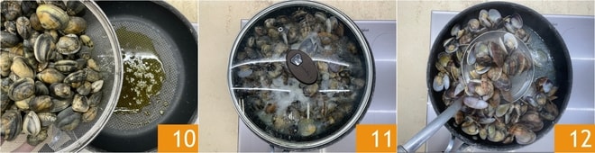 Dès que l'ail remontera à la surface, ajoutez les palourdes 10, couvrez avec le couvercle (de préférence en verre) 11 et faites cuire à feu moyen jusqu'à ce qu'elles soient toutes ouvertes. À ce stade, retirez les palourdes avec une écumoire 12 pour les séparer de leur jus de cuisson.