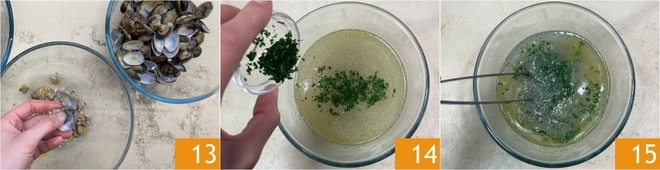 Écaillez les palourdes et réservez-les dans un bol 13. Versez le jus de cuisson dans un autre bol, en laissant éventuels résidus dans la poêle, puis ajoutez le persil haché 14, mélangez et réservez 15.