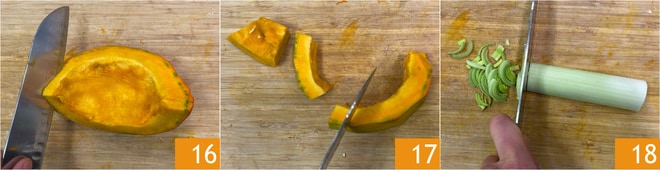 Passez à la sauce de potiron : pelez le potiron 16 et coupez 200 g de pulpe en dés 17, puis nettoyez le poireau et émincez finement la partie blanche 18.