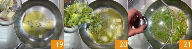 Dans une poêle, faites fondre doucement le beurre avec l'huile 19, puis ajoutez le poireau 20. Baissez le feu, couvrez avec le couvercle et étuvez doucement le poireau pendant quelques minutes 21.