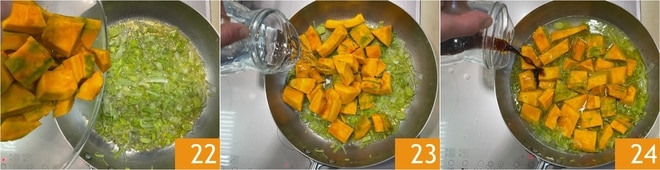 À ce stade, ajoutez le potiron 22, puis versez l'eau 23 et la sauce soja 24. Couvrez avec le couvercle et faites cuire pendant 20 minutes.