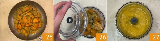 Lorsque le potiron sera cuit, le poids du contenu de la poêle devra être de 450 g 25. Transférez le tout dans un mixeur 26 et mélangez pour obtenir une consistance lisse et homogène 27. Ajustez la sauce de potiron avec du sel et réservez.