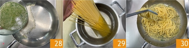 Portez à ébullition une casserole d'eau salée et versez une partie du jus de cuisson des palourdes dans une poêle 28. Entre-temps, chauffez de l'eau non salée dans une autre petite casserole. Cuisez les spaghetti pendant 5 minutes 29, puis transférez-les dans la poêle 30.