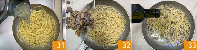 Finissez de cuire les spaghetti en alternant le jus des palourdes avec l'eau non salée, une louche à la fois 31. Goûtez de temps en temps pour vérifier la salinité et ajustez en conséquence le liquide à ajouter. Terminez la cuisson des pâtes en ajoutant également un filet d'huile. Quand vous aurez obtenu une belle crème, faites sauter les spaghetti hors du feu et ajoutez les palourdes écaillées 32. Ajoutez encore une petite louche de liquide et un filet d'huile 33 et faites sauter à nouveau le tout pour bien mélanger, toujours hors du feu.