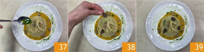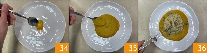 Vous êtes prêt à dresser : étalez la moutarde de mandarines à la base 34, puis recouvrez avec la sauce de potiron 35 et disposez par-dessus un nid de spaghetti avec les palourdes 36.