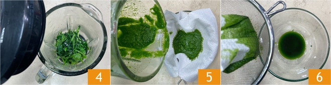 Mélangez le tout pendant 30 secondes 4, puis versez la purée obtenue dans une passoire tapissée de papier absorbant que vous aurez placée au-dessus d’un bol 5. Laissez égoutter au réfrigérateur, même toute la nuit : ainsi, l'eau de végétation se déposera au fond du bol tandis que l'huile de persil coulera goutte à goutte, restant à la surface 6. À la fin de la recette, vous aurez besoin à la fois de l'huile et de la pâte de persil restante dans le papier absorbant.
