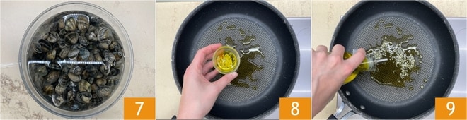Lorsque l'huile de persil sera presque prête, vous pouvez vous consacrer aux palourdes : laissez-les tremper dans un litre d'eau et 25 g de sel pendant une heure 7. Après ce temps, secouez-les dans un bol et assurez-vous qu'il n'y ait pas de résidus de sable ; le cas échéant, répétez le trempage. Après ce temps, commencez à faire doucement revenir l'ail émincé avec un filet d'huile dans une poêle 8, puis versez 100 g d'huile d'olive vierge extra supplémentaires 9.
