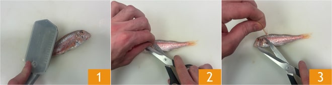 Pour préparer les spaghetti aux rougets avec amandes et fenouil, commencez par nettoyer le poisson. Tout d'abord, écaillez les rougets avec l'outil approprié 1 ou en utilisant le dos d'un couteau. Coupez les nageoires latérales 2 et la nageoire dorsale 3.