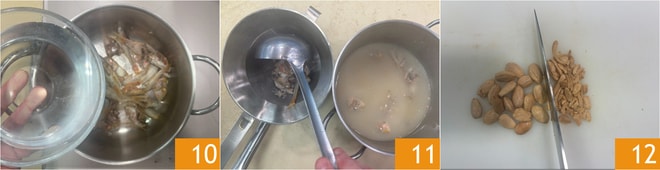 Mettez les restes de rouget dans une casserole, couvrez d'eau froide 10 et faites cuire pendant 20 minutes ou jusqu'à ce que le volume ait été réduit de ¾. Filtrez et réservez le bouillon 11. Coupez les amandes grillées en fines lamelles 12.