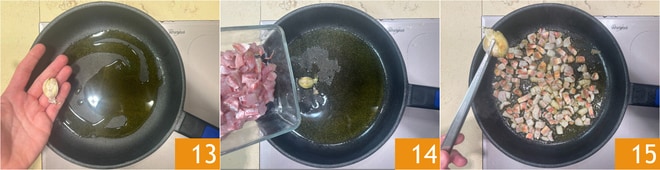 Dans une poêle, versez un filet d'huile, ajoutez l'ail 13 et faites-le revenir quelques minutes. Ajoutez les filets de rouget 14 et faites sauter à feu vif pendant 2-3 minutes, puis retirez l'ail 15.