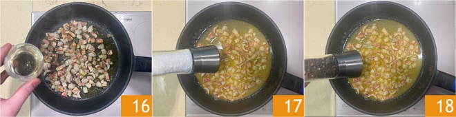 Déglacez avec du vin blanc 16, assaisonnez de sel 17 et de poivre 18.