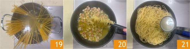 Faites cuire les spaghetti dans de l'eau bouillante salée 19, quand il reste 2 minutes avant la fin de la cuisson, transférez-les dans la poêle 20, arrosez de bouillon et terminez la cuisson 21.