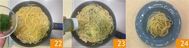 Enrobez les spaghetti en ajoutant du fenouil sauvage haché 22 et un filet d'huile 23. Dressez les spaghetti 24.