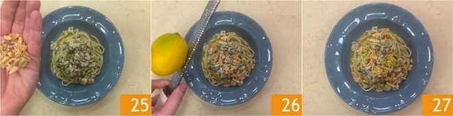 Ajoutez la sauce aux rougets, les amandes grillées 25, le fenouil haché et terminez avec du zeste de citron râpé 26. Les spaghetti aux rougets avec amandes et fenouil sont prêts à être servis 27.
