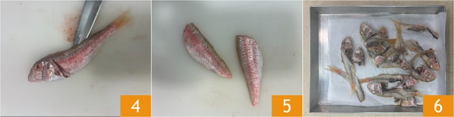 Aidez-vous d'une paire de ciseaux pour inciser le ventre du poisson jusqu'à la tête et rincez sous l'eau courante pour éliminer les viscères internes. Faites une incision diagonale, juste après les branchies, qui part du dos et rejoint l'incision faite précédemment sur le ventre. Incisez la queue et la partie dorsale du poisson en suivant la colonne vertébrale 4 et prélevez les filets 5. Procédez de la même manière pour tous les rougets. Disposez les têtes et les arêtes sur une plaque, couverte de papier cuisson, et faites-les sécher au four à 180°C pendant 15-20 minutes 6.