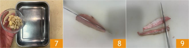 Avec les restes de rouget, mettez également les amandes au four 7, retirez-les dès qu'elles deviennent dorées. Entre-temps, coupez les filets de rouget d'abord en deux 8 puis en dés d'environ 1 cm 9. Réservez.