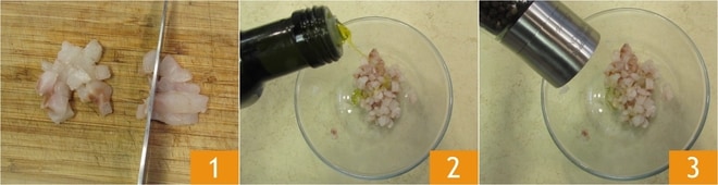 Pour réaliser les spaghetti avec sauce de Monte Veronese et tartare de bar, commencez par hacher les filets de poisson au couteau, après avoir éliminé d'éventuelles arêtes 1. Transférez le bar dans un bol et assaisonnez avec de l'huile 2 et du poivre 3. Mélangez et couvrez avec un film plastique, puis laissez au réfrigérateur jusqu'à l'utilisation.