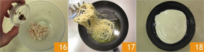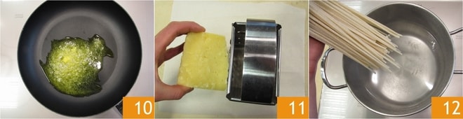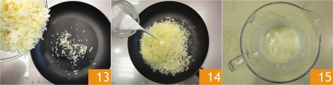 Pendant que les pâtes cuisent, préparez la sauce de Monte Veronese : versez le fromage râpé dans une poêle antiadhésive 13, ajoutez la crème 14 et mélangez à feu doux pour le faire fondre complètement. Une fois prête, réservez la sauce de Monte Veronese 15.