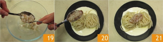 À l'aide de 2 cuillères, formez des quenelles 19 et placez la tartare sur le dessus de l'assiette 20. Vos spaghetti avec sauce de Monte Veronese et tartare de bar sont prêts à être servis 21 !