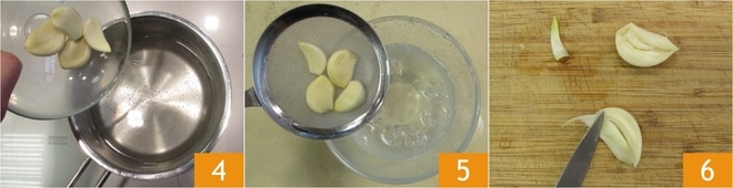 Passez à la crème d'ail : épluchez les gousses d'ail et blanchissez-les quelques secondes 4, puis plongez-les dans un bol avec de l'eau et de la glace 5. Répétez cette opération 3 fois, après quoi éliminez le germe interne 6.