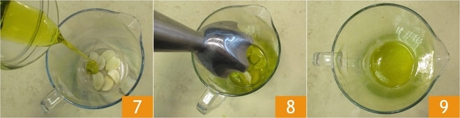 Transférez les gousses dans un récipient, ajoutez l'huile 7 et mixez avec un mixeur plongeant 8 jusqu'à obtenir une consistance homogène 9.