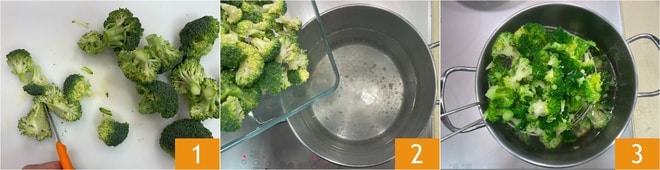 Pour préparer les spaghetti brocolis et crevettes, commencez par nettoyer le brocoli et prélevez les fleurons 1. Portez une casserole d'eau salée à ébullition, ajoutez les fleurons 2 et faites cuire pendant 5 minutes ; ils doivent être tendres mais encore croquants. Égouttez les brocolis 3 et réservez l'eau de cuisson pour cuire les pâtes.
