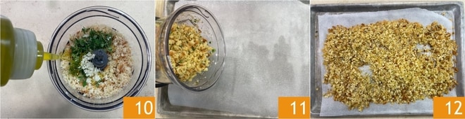 Enfin, ajoutez un filet d'huile 10 et une pincée de sel. Mixez de nouveau pour tout amalgamer, puis répartissez les miettes aromatisées sur une plaque recouverte de papier sulfurisé 11. Faites cuire au four statique préchauffé à 180° pour 10-15 minutes 12.