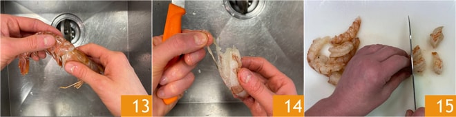 En attendant, occupez-vous des crevettes : détachez la tête du corps 13, puis retirez la carapace et les pattes et enlevez le filament noir sur le dos 14. Vous devriez obtenir environ 200 g de chair, que vous couperez en gros morceaux 15.
