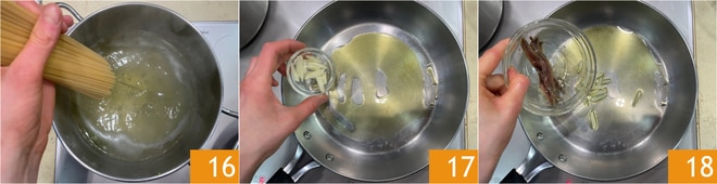 Cuisez les spaghetti dans l'eau de cuisson des brocolis 16. Pendant ce temps, chauffez un filet d'huile dans une grande poêle avec les gousses d'ail coupées en tranches 17 et les anchois 18. Vous pouvez également ajouter une pincée de piment pour relever.