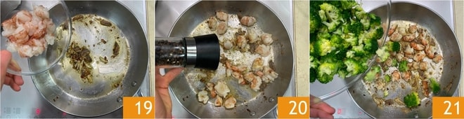 Lorsque les anchois sont fondus, ajoutez les crevettes 19, salez et poivrez 20. Faites sauter les crevettes pendant 3-4 minutes à feu moyen, elles ne doivent pas être complètement cuites. À ce stade, ajoutez les brocolis 21.