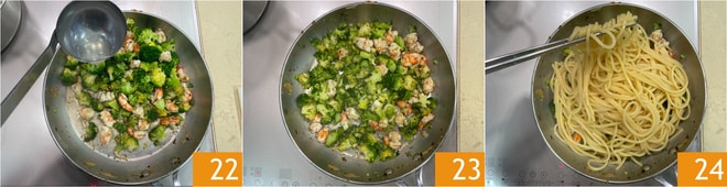 Ajoutez également une louche d'eau de cuisson des pâtes 22 et faites cuire pendant encore une minute 23, en écrasant les brocolis avec une cuillère en bois. Égouttez les spaghetti directement dans la poêle avec l'assaisonnement 24 et mélangez brièvement pour bien amalgamer.