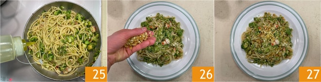 Éteignez le feu et ajoutez un filet d'huile pour lier le tout 25. Servez et complétez avec la chapelure croquante 26. Vos spaghetti brocolis et crevettes sont prêts à être dégustés 27 !