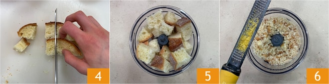 Passez à la chapelure aromatisée : coupez le pain rassis en gros cubes 4, transférez-le dans un mixeur 5 et mixez pour le réduire en miettes grossières, puis ajoutez le zeste de citron râpé 6.