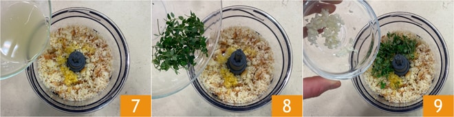 Ajoutez également le jus de citron 7, les feuilles de thym 8 et la gousse d'ail hachée 9.