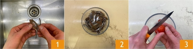 Pour préparer les spaghetti de sarrasin avec anchois et tomates cerises, commencez par nettoyer les anchois frais : après avoir retiré la tête, incisez le dos pour enlever l'arête centrale 1 et éviscérez-les. Rincez-les bien sous l'eau courante et réservez-les 2. Incisez la peau des tomates cerises 3.