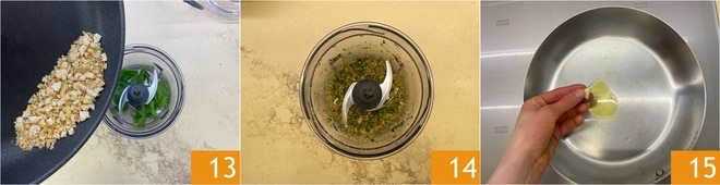 Transférez à nouveau le pain dans le mixeur avec le persil 13. Hachez grossièrement le tout 14. Dans une autre poêle, chauffez un peu d'huile et l'autre moitié de la gousse d'ail restante 15.