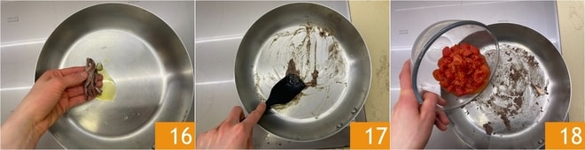 Ajoutez les anchois salés, que vous aurez préalablement dessalés 16, et faites-les fondre dans la poêle pour créer un fond savoureux 17. Versez la chair des tomates cerises 8.