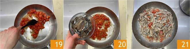 Faites sauter les tomates cerises quelques minutes pour les ramollir 19, puis ajoutez les anchois frais, en gardant quelques-uns de côté pour le dressage 20. Cuisez à feu doux pendant 10-15 minutes jusqu'à ce que la sauce commence à épaissir 21.