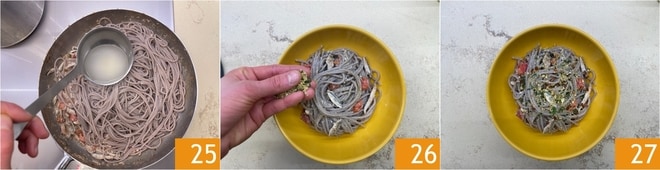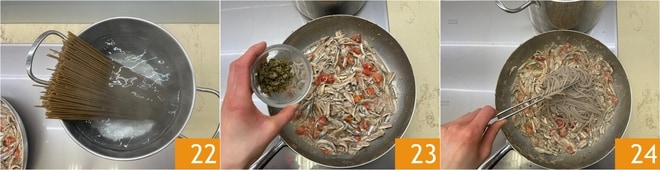 Entre-temps, cuisez les pâtes al dente dans de l'eau bouillante salée 22. Quand il reste quelques minutes avant la fin de la cuisson, ajoutez à la sauce une pincée de piment, les câpres 23 et une poignée de persil haché. Égouttez les pâtes et transférez-les dans la poêle avec la sauce 24.