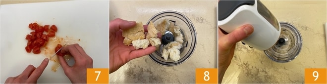 Coupez la chair des tomates cerises en quartiers 7 et réservez. Hachez dans un mixeur le pain sec 89 pour le réduire en grosses miettes.