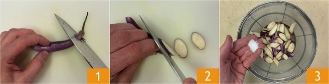 Pour préparer les spaghetti aux aubergines, pecorino et moules, commencez par l’aubergine japonaise : coupez-en les extrémités 1 et découpez-la en fines tranches 2. Transférez les tranches d’aubergine dans une passoire, salez 3 et laissez dégorger pendant au moins une heure.