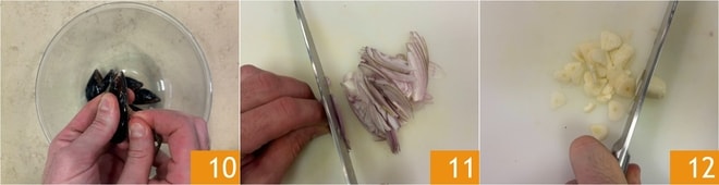 Pendant ce temps, nettoyez les moules en retirant le byssus et les impuretés 10. Nettoyez et émincez l’échalote 11 et l’autre gousse d’ail 12.