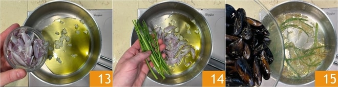 Mettez l’échalote et l’ail dans une poêle avec un filet d’huile 13, ajoutez les tiges de persil 14 et laissez infuser, puis ajoutez les moules 15.