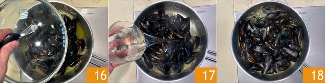 Couvrez avec le couvercle pendant 30 secondes 16, puis déglacez avec le vin blanc 17 et attendez qu’elles s’ouvrent 18.