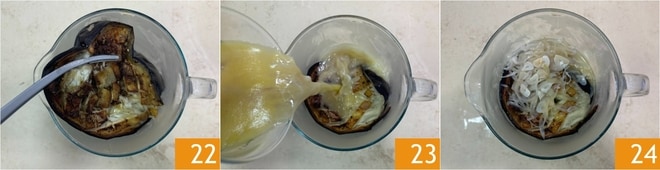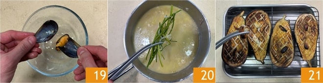 Transférez les aubergines dans un récipient 22, puis ajoutez le jus de cuisson des moules 23 avec l’ail et l’échalote 24.