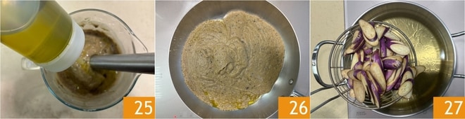 Mixez avec un mixeur plongeant tout en versant l’huile en filet 25 jusqu’à obtenir une crème lisse et homogène. Remettez la crème dans la poêle 26 et pendant ce temps, portez à ébullition une casserole d’eau salée. Après le temps de dégorgement de l’aubergine japonaise, rincez rapidement et faites frire dans l’huile de graines à 140° 27.