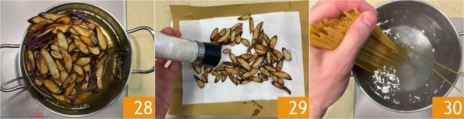 Quand elles seront bien dorées, égouttez 28 et transférez sur du papier absorbant, puis salez 29. Cuisez les spaghetti quelques minutes de moins que le temps indiqué sur l’emballage 30.