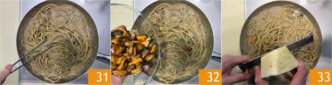 Égouttez les pâtes et terminez la cuisson dans la poêle avec la crème d’aubergines 31. Hors du feu, ajoutez les moules 32 et le pecorino râpé 33. Mélangez bien pour tout amalgamer et dressez.
