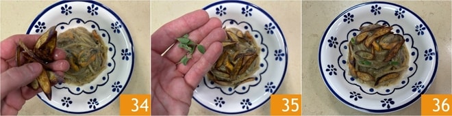 Complétez le plat avec les aubergines frites 34 et quelques feuilles de marjolaine 35. Vos spaghetti aubergines, pecorino et moules sont prêts à être servis 36 !
